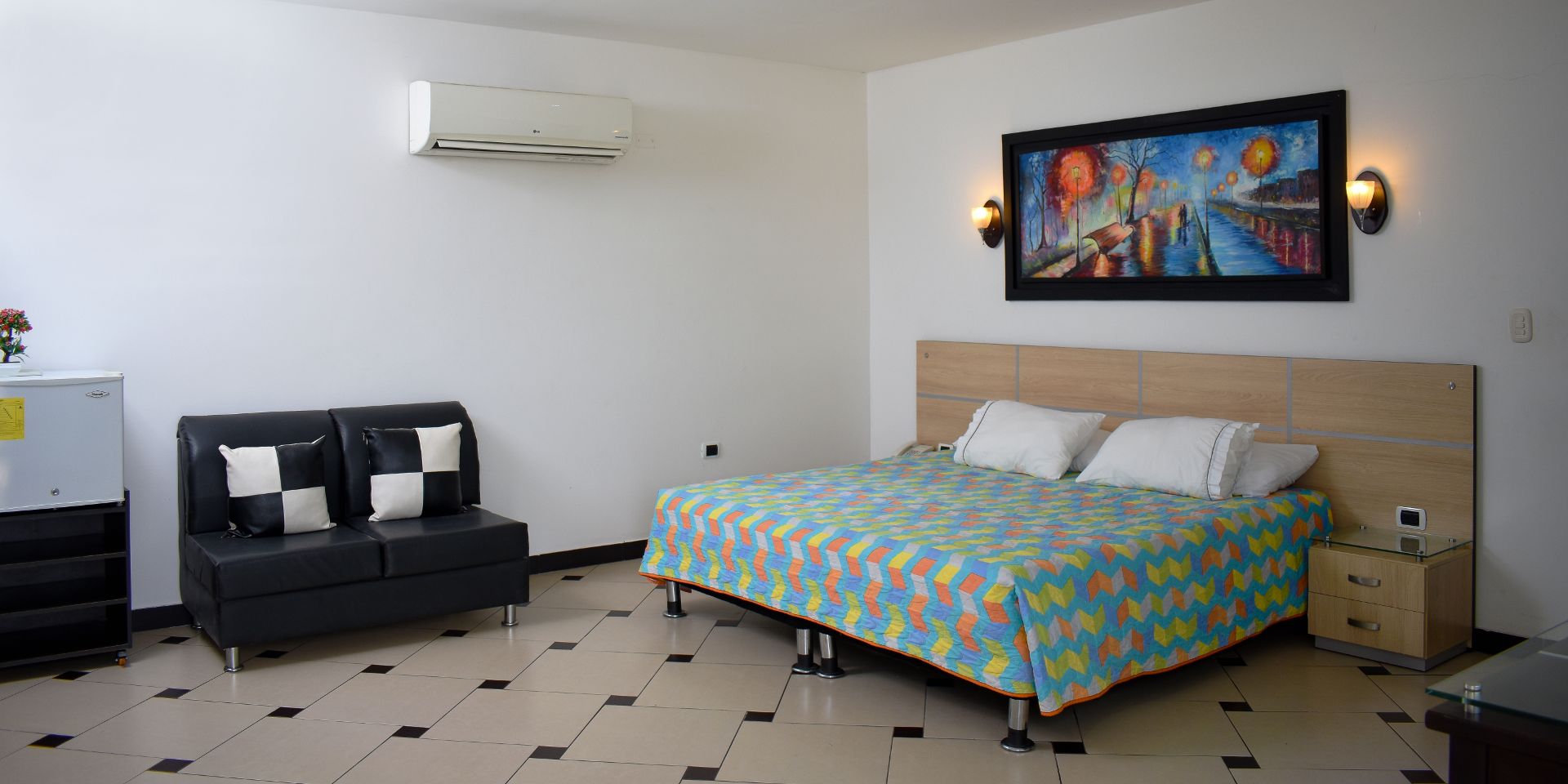 Habitación con una cama matrimonial y dos camas de 1.0 x 1.0 mts, tv de 32 pulgadas con direc tv, aire acondicionado, escritorio, mini bar,...